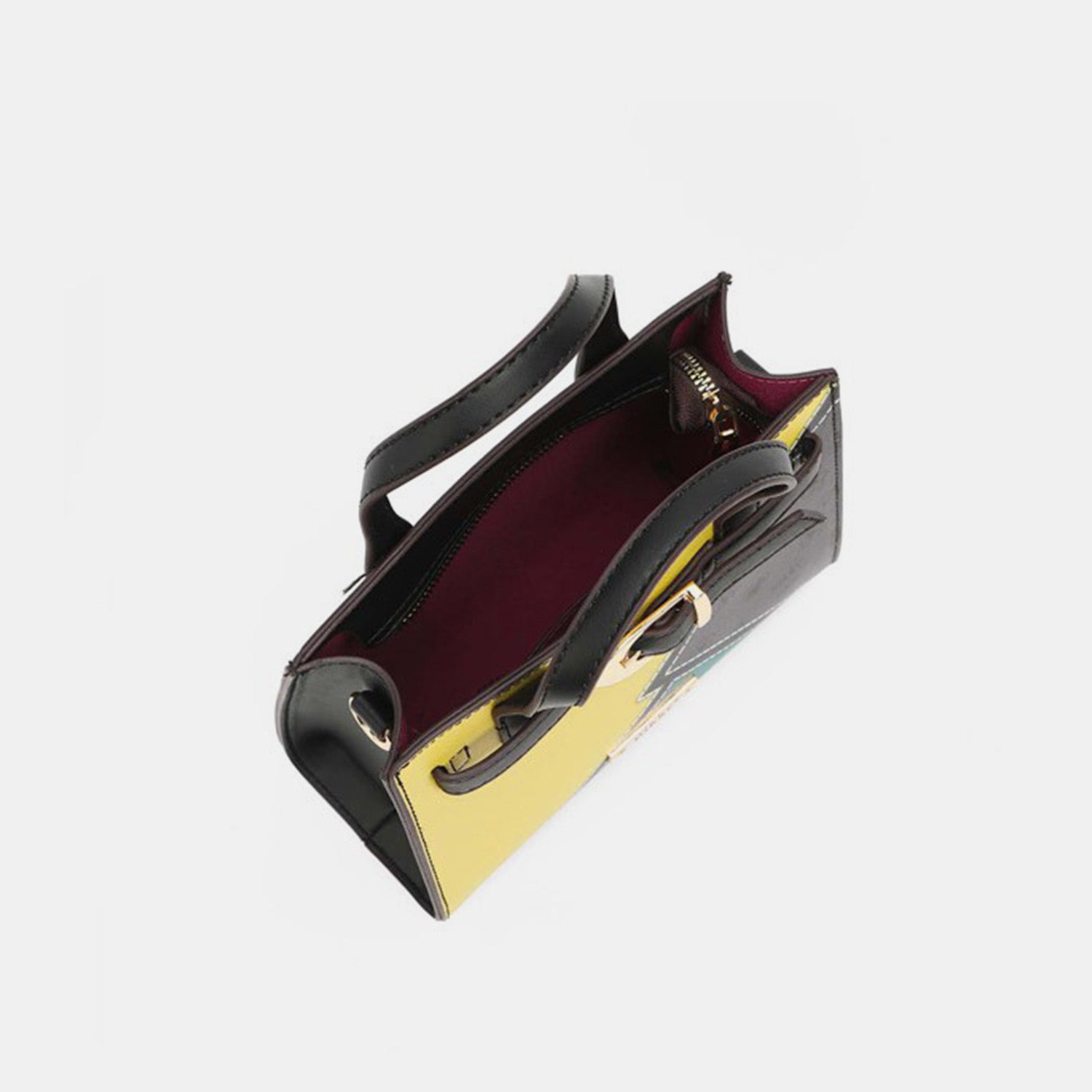 Main zipper closure with buckle magnetic clasp going over the zipper closure on the center. Monogrammed NK logo print on front with geometrical design. Nikky logo nameplate at front. Top 4.5" eco-leather handles. Adjustable and Detachable 45"- 48" shoulder strap.