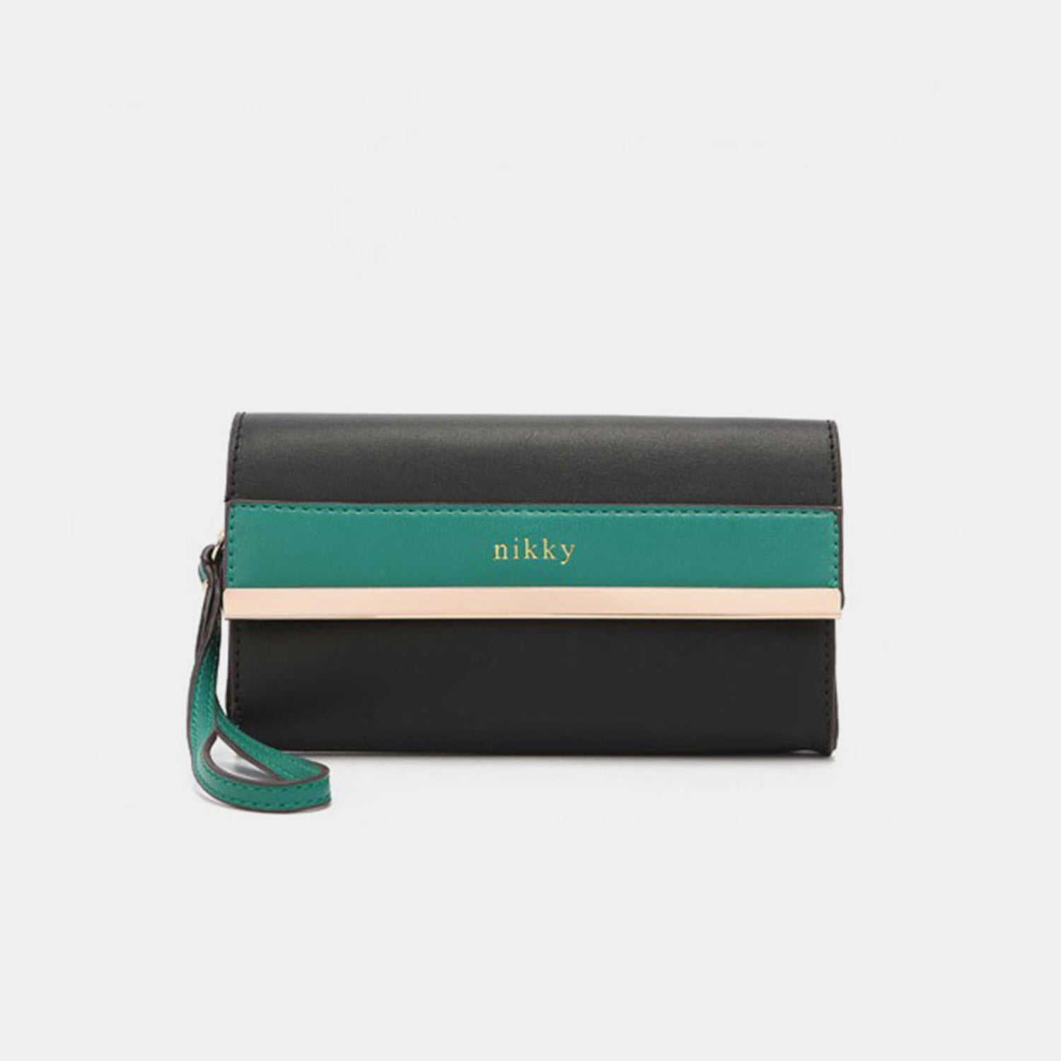 Large main compartment. Two open wall pockets at back and one zipper wall pocket at front and an eco-leather keychain strap for easy key access. Lined with Nikky signature polka-dot print polyester fabric.